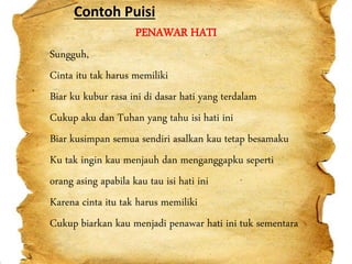 Aku bukan seorang pangeranYang mampu mendapatkan cintanya dengan hanya menunjuk siapa diaAku bukanlah seorang arjunaYang mampu memikat hati wanita dengan ketampananyaTapi. Cinta tak harus memiliki. Dalam hal ini penyair harus mencari bahan-bahan atau sumber tulisan yang dapat digunakan.